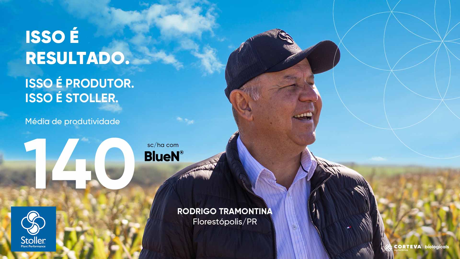 Rodrigo Tramontina está prestes a iniciar sua 20ª safra de soja, utilizando as soluções Stoller, também presentes no manejo do milho safrinha. Nesse período, a Stoller faz parte de toda a sua história, da sua construção em busca de altas produtividades e rentabilidade. Com foco em resultados consistentes, Rodrigo destaca o papel do BlueN como aliado na manutenção da produtividade, mesmo diante de condições adversas:
