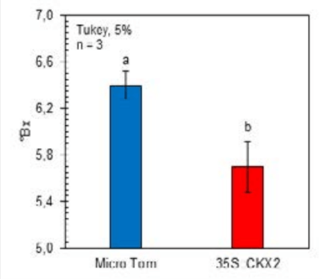 Figura 3. Teor de açúcar em frutos maduros de plantas controle (Micro Tom) e deficientes em citocinina (35S::CKX2).