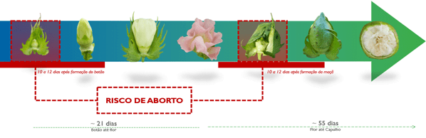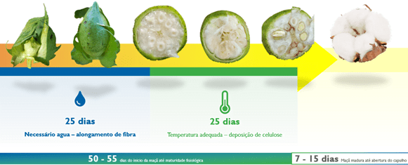 Vale lembrar nessa fase que desde o aparecimento da maçã até sua maturidade, levam cerca de 50 a 55 dias em média. Desse tempo, a primeira metade é crucial que se tenha água disponível no sistema (e sistema radicular bem formado), pois é o momento de alongamento da fibra que está se formando. Em seguida, na segunda metade, é quando estará ocorrendo a deposição das camadas de celulose nas fibras, momento em que a ocorrência de temperaturas baixas (abaixo de 18°C) pode comprometer significativamente esse processo e repercutir na qualidade da fibra. Durante a fase de enchimento das maçãs o manejo fisiológico, feito através de tecnologias que otimizam esses processos, permite ganhos significativos e maior peso de capulhos.