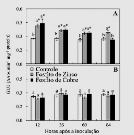 Além de poder atuar diretamente sobre o desenvolvimento do fungo, os resultados demonstraram que o uso do Fosfito de Zinco também aumentou a atividade da enzima ß-1,3-glucanase nas folhas de feijoeiro, demonstrando que plantas bem nutridas conseguem se defender melhor dos patógeno (Figura 3A). Vale ressaltar ainda que, na ausência do patógeno, a aplicação do composto não resultou em aumento da atividade da referida enzima, indicando que neste caso não houve custo energético para a planta (Figura 3B).