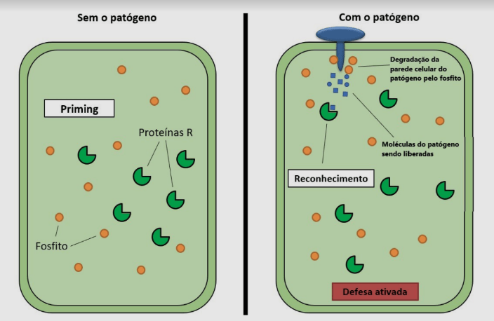 O fosfito pode atuar de maneira direta e/ou indireta no controle de doenças, isto é, apresenta efeito negativo sobre o desenvolvimento do micro-organismo e positivo sobre os mecanismos de defesa das plantas. Em trabalho conduzido pelo pesquisador Ronaldo José Durigan Dalio (Universidade de São Paulo), foi demonstrado que, após a aplicação nas plantas, o fosfito se acumula nas células vegetais, deixando-as em estado de alerta (em inglês, estado de “priming”) sem, no entanto, acarretar em custo energético para as mesmas. Quando ocorre a chegada do patógeno, o fosfito já está presente na célula em concentrações tóxicas ao micro-organismo, causando a degradação da parede celular e a liberação de compostos que serão prontamente reconhecidos pela planta, culminando em uma mais rápida e intensa ativação do seu sistema de defesa em comparação com plantas que não receberam a aplicação do composto (Figura 4).