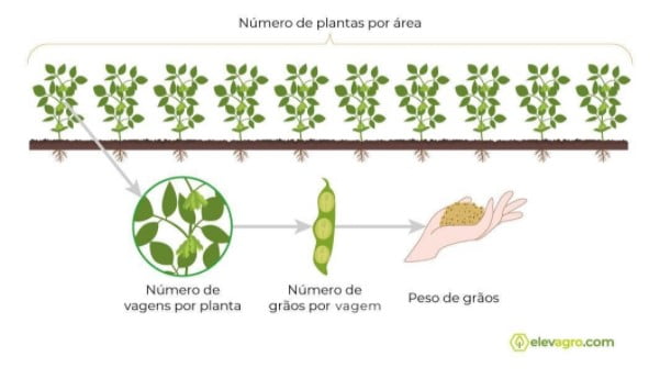 Os componentes primários de produtividade da soja correspondem ao número de plantas por área, número de vagens por planta, números de grãos por vagem e o peso de grãos (Figura 1). Esses componentes são essenciais para a produtividade final da cultura.