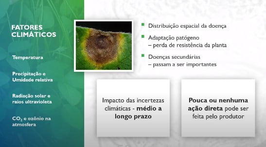 Na verdade, em algumas situações até é possível minimizar os impactos, como por exemplo: a adoção de um plantio direto que no caso do algodoeiro reduz a incidência de ramulária; o ajuste de população de plantas no talhão e até a adoção de quebra-vento para a redução de incidência de phoma no cafeeiro. Porém, quando olhamos para o macroclima, não temos praticamente nenhuma ação direta.