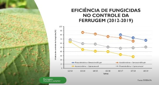 Em termos de controle de doença, há a diminuição da eficiência dos fungicidas ao longo das safras. Para alguns produtos, a eficácia de controle já vem caindo ano a ano. Ou seja, o fungo já está menos sensível aos efeitos destes produtos.