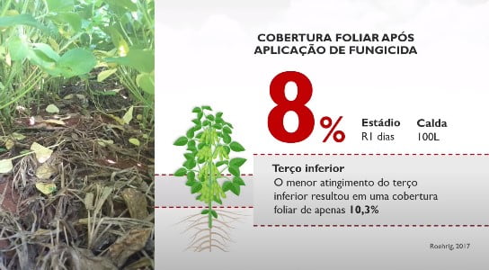 Em um trabalho desenvolvido na Universidade de Passo Fundo, após a aplicação de fungicida em soja no estádio R1, apenas 8% do total de gotas atingiram efetivamente o terço inferior das plantas. Essa menor quantidade de gotas atingindo as folhas do baixeiro resultou em uma cobertura foliar de somente 10%, bem abaixo dos 90% observados no terço superior.