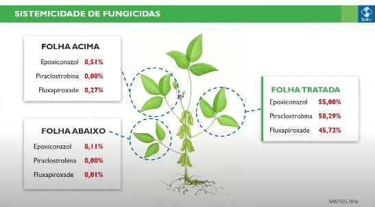 Um outro aspecto a ser destacado sobre os fungicidas é a sua ação sistêmica nas plantas, isto é, a sua capacidade de serem absorvidos pelas folhas e translocados para outras partes que não receberam o produto de maneira satisfatório. No entanto, o que podemos analisar com a imagem abaixo é que os princípios ativos dos fungicidas sistêmicos apresentam baixa mobilidade no sentido basipetal. Ou seja, eles deixam desprotegido o baixeiro da planta, que por sua vez vai servir como porta de entrada para o estabelecimento dos patógenos na lavoura.