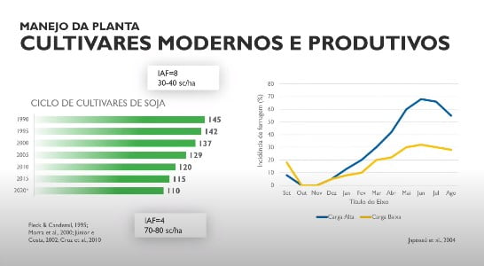 Na figura abaixo, o gráfico da esquerda nos mostra, ao longo dos anos, como as cultivares de soja foram evoluindo para os atuais padrões de porte, duração de ciclo e os altos níveis de produtividade. Além de serem mais produtivas, as cultivares modernas apresentam também ciclo e porte menores. Por um lado, isso demonstra a sua elevada eficiência; por outro, uma alta sensibilidade a estresses abióticos e bióticos.