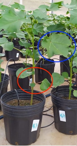 Figura 3: Diferença da morfologia foliar dos cotilédones (círculo vermelho) e folhas verdadeiras (círculo azul) em uma planta jovem de algodão.