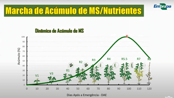 Figura 2. Marcha de acúmulo de Matéria Seca (MS) e nutrientes na cultura da soja. Destacado em vermelho o período de máxima absorção de MS e nutrientes.