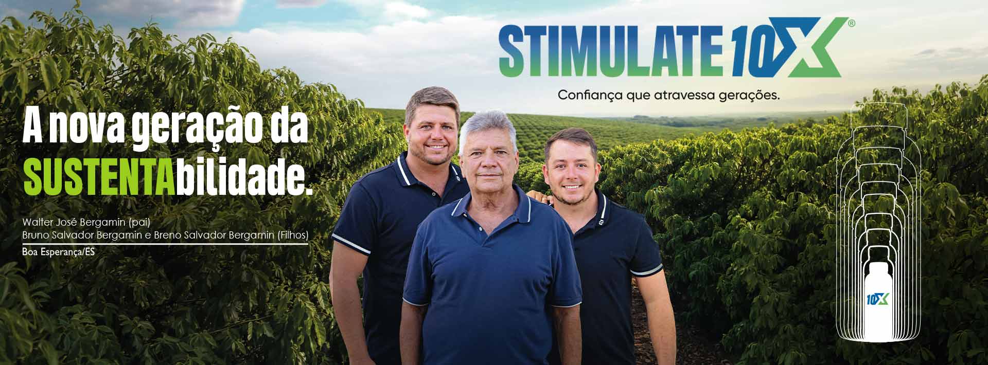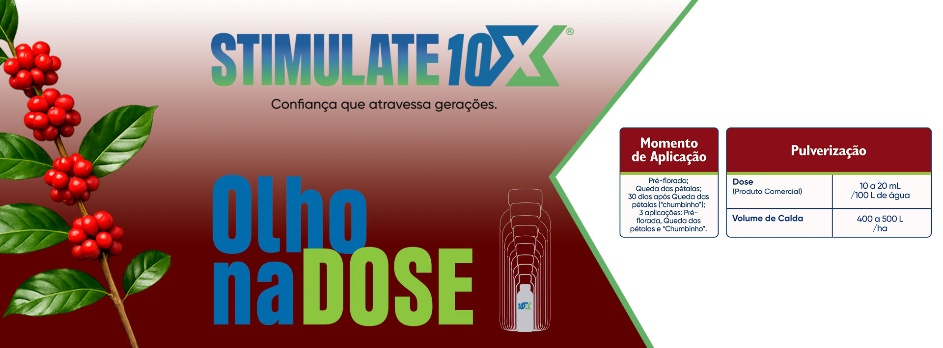 O Stimulate 10X tem a confiança que atravessa gerações para as principais fases de desenvolvimento do cafeeiro. Com sua formulação, o regulador de crescimento assegura plantas de café com alta resiliência e um aumento significativo da produtividade, pela ação dos promotores de crescimento em sua composição. O regulador de crescimento pode ser aplicado diretamente nas plantas de café, minimizando os efeitos do estresse, contribuindo para o desenvolvimento do cafeeiro e maximizando os ganhos nos componentes de produtividade por promover o adequado balanço hormonal.